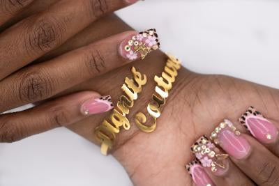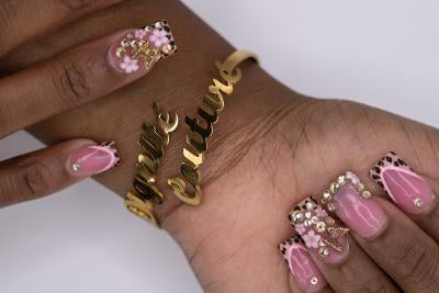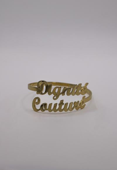 raised lettering of the brand name Dignité Couturé encircling the bracelet