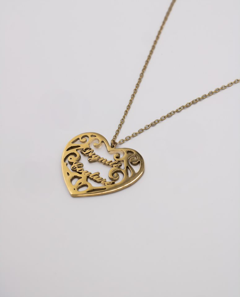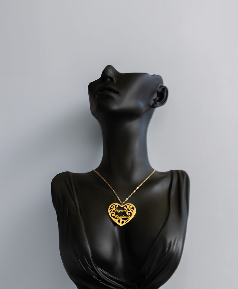 Elevate your elegance with the Heartless Glare from Dignité Couturé. This stunning piece is crafted from high-quality stainless and finished with luxurious gold coating, offering a sleek, modern twist on timeless symbol of love. The heart-shaped design is delicately engraved with the Dignité Couturé brand name in he center, adding a touch of sophistication and exclusivity. Perfect for those who crave bold style with a hint of mystery, this neckless is a must-have statement accessory that effortlessly blends beauty with edge. Wear it stand out, make a statement, and embody a truly unforgettable allure.