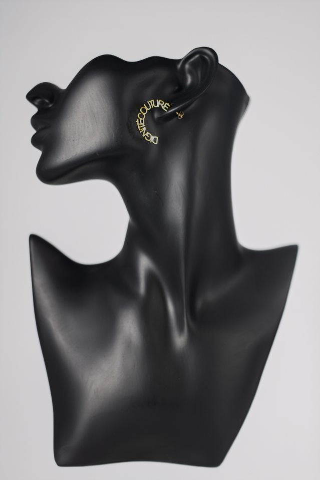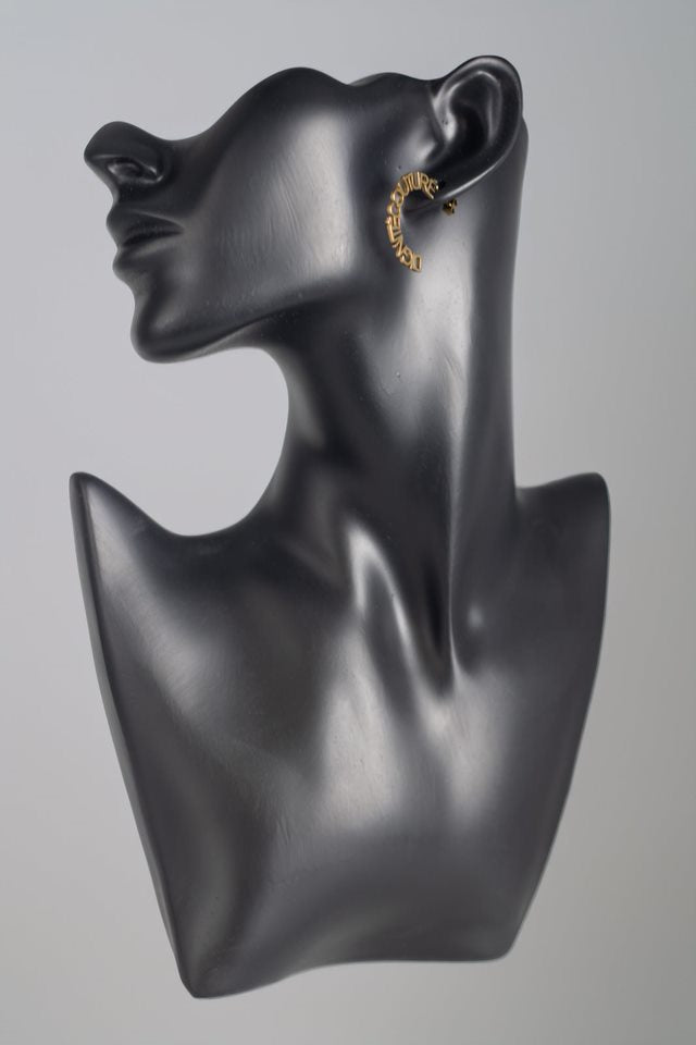 Step into the spotlight with the Regal Radiance Earrings, an embodiment of elegance and bold luxury. Designed to wrap gracefully around the ear, these stunning earrings spell out "Dignité Couturé" in sparkling gold, making a statement that exudes sophistication. Crafted for the modern soul who dares to dazzle, these earrings add a touch of royal allure to any outfit. Whether you're dressing up for a special occasion or elevating your everyday look, these earrings offer a regal touch that's impossible to ignore.